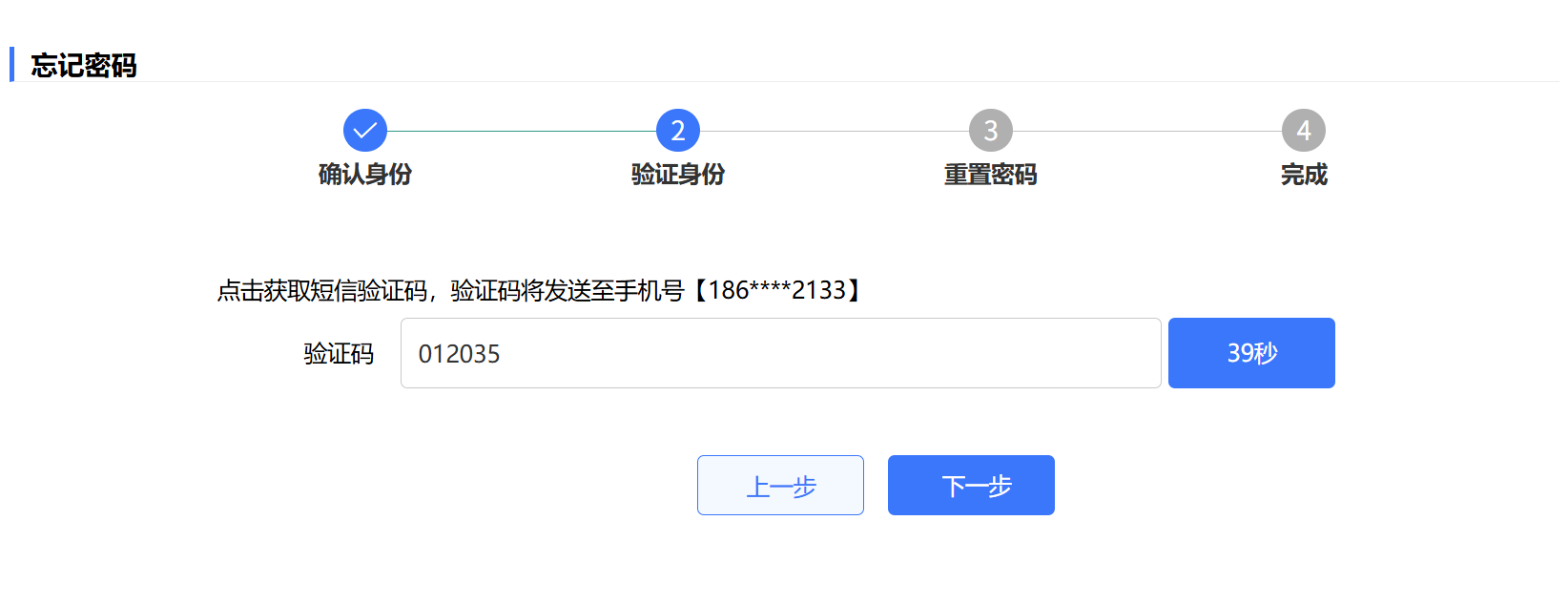 点击“手机验证”后,进入验证身份页面。点击“发送验证码”,系统会立即将验证码发送到手机上。准确填写手机验证码后,点击“下一步”。