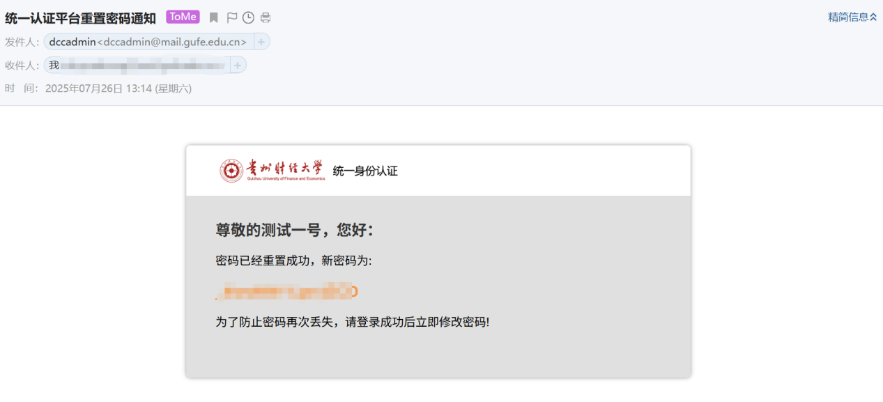 待管理员处理完毕后,登录输入的电子邮箱,打开“统一认证平台重置密码通知”邮件即可获取重置的新密码。为了防止密码再次丢失,请登录新版数字贵财后立即修改密码!