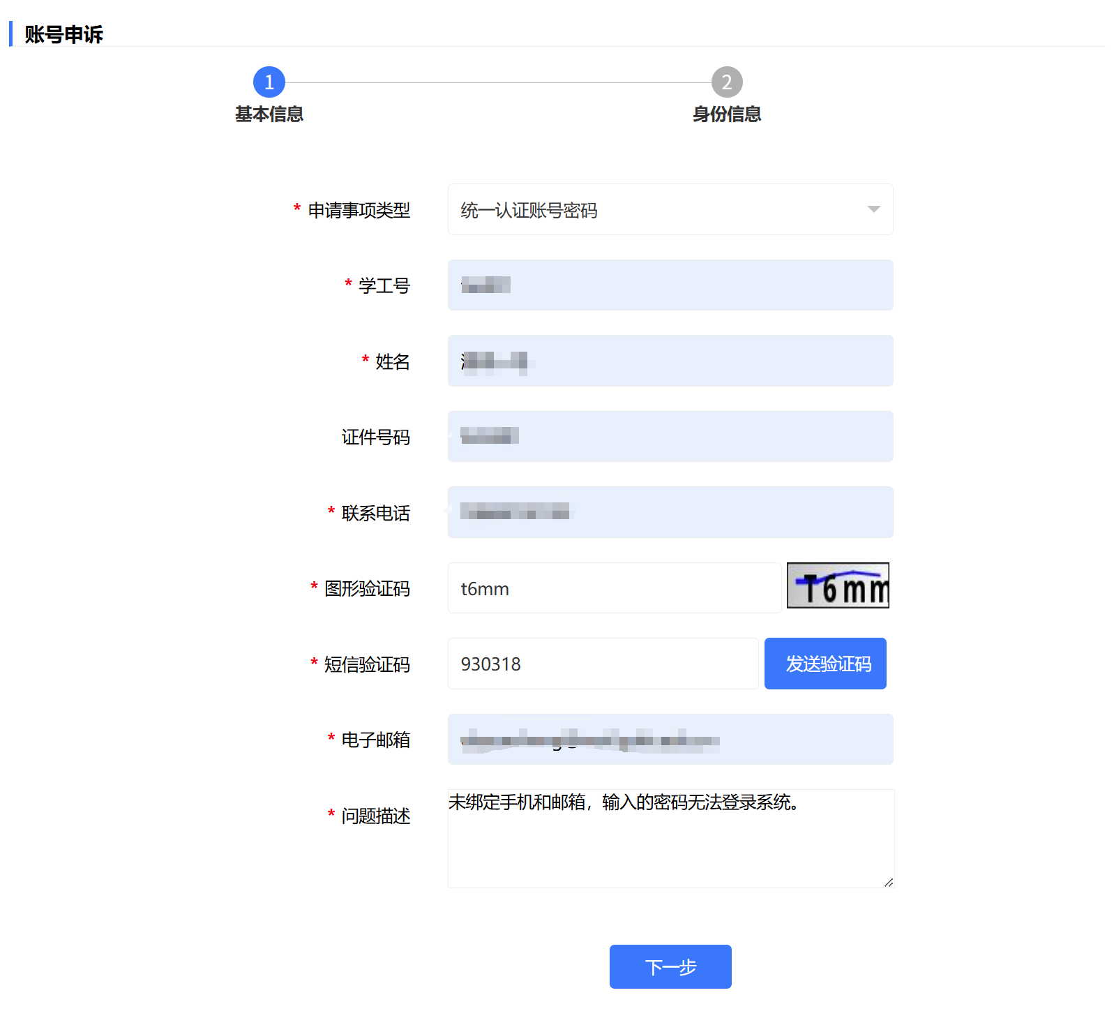 在账号申诉的基本信息页面,正确选择申请事项类型,此处选择“统一认证账号密码”。请准确填写本人使用的手机号码和电子邮箱,方便获取短信验证码和系统自动重置的新密码。在“问题描述”处简要描述申诉的问题。点击下一步,进入身份信息确认页面。