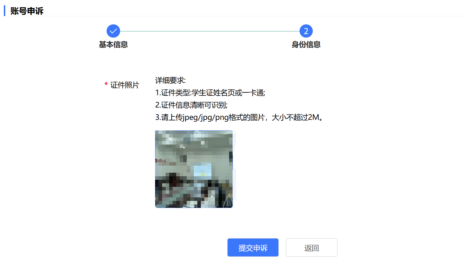 在身份信息确认页面,按要求上传学生证姓名页或者一卡通个人信息面的照片。照片格式为jpeg、jpg或png格式,大小不能超过2M。点击“提交申诉”后,系统提示“提交成功”,返回登录页面。