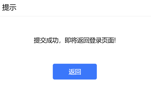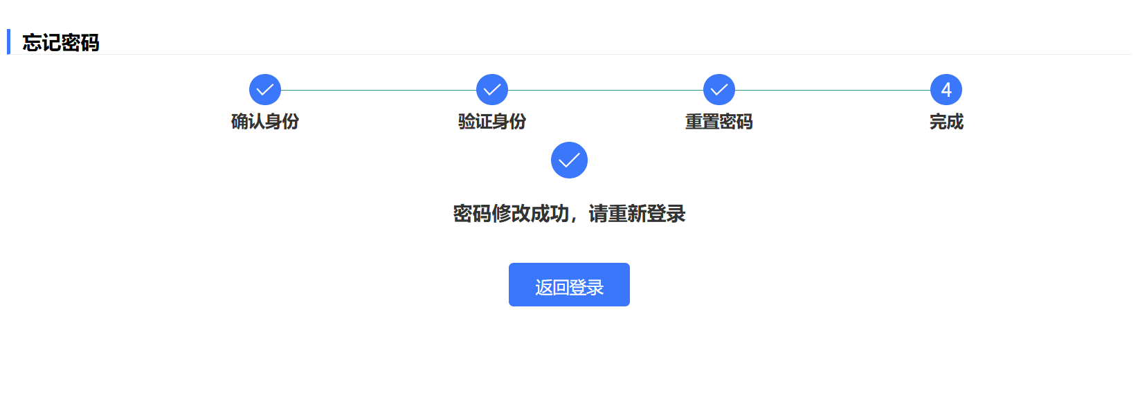 点击“完成”后,系统提示“密码修改成功”,点击“返回登录”回到登录页面。
