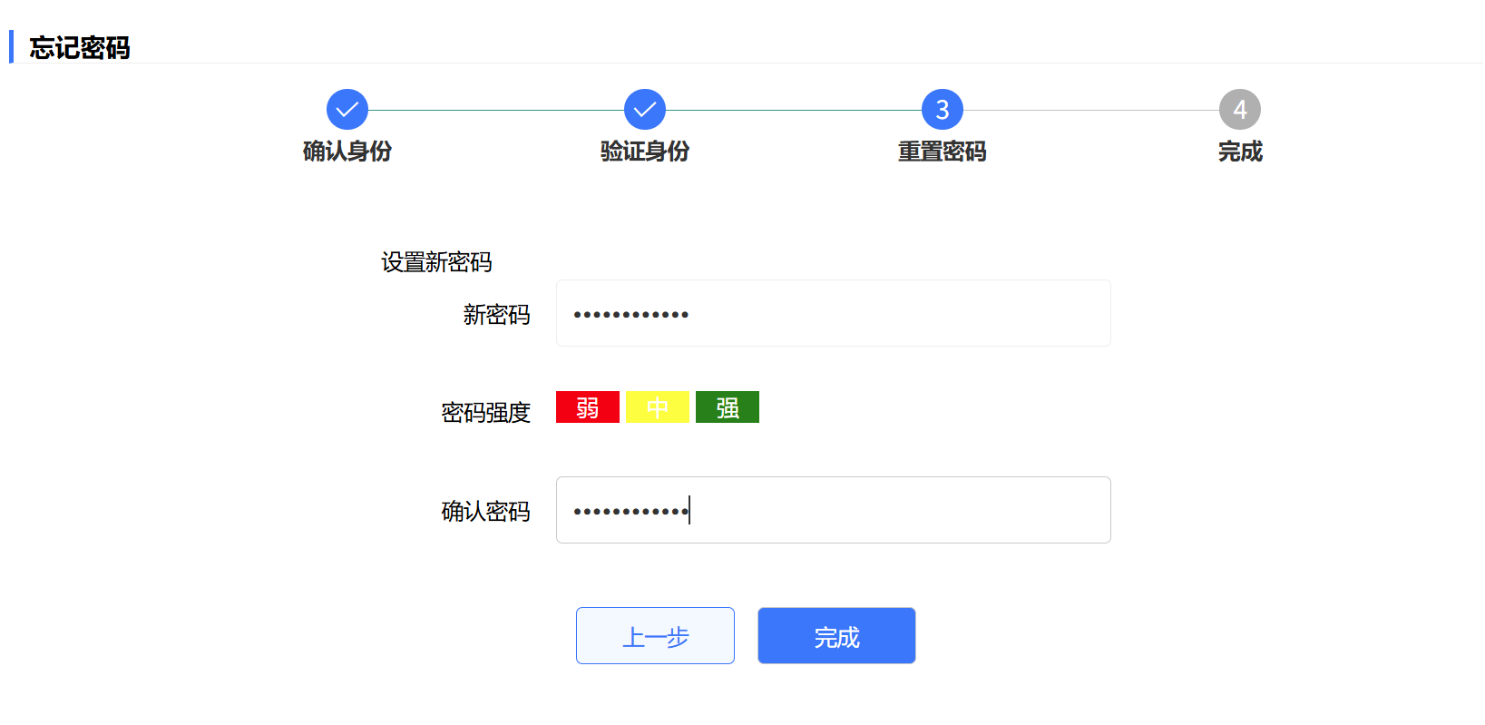 在重置密码页面,输入新密码后点完成,即完成密码重置。密码务必包含大小写字母、数字和特殊符号,确保密码为强密码。