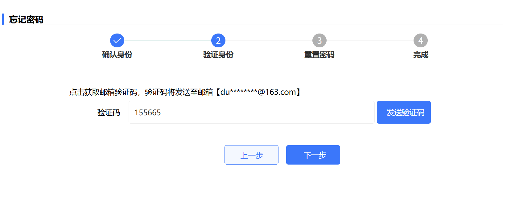 点击“邮箱验证”后,进入身份验证页面。点击“发送验证码”,系统会立即将验证码发送到绑定的电子邮箱。