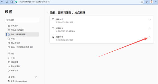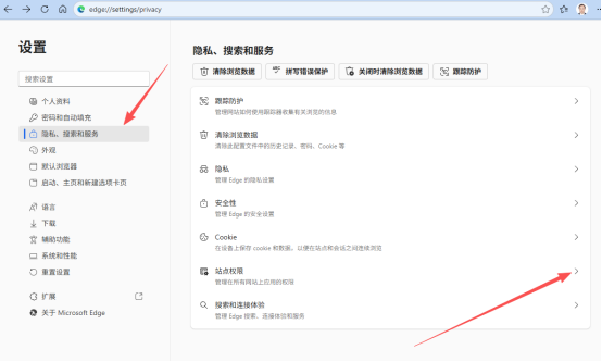 点击左侧的“隐私、搜索和服务”,再选择右侧的“站点权限”。
