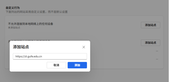 点击“添加站点”,输入https://zt.gufe.edu.cn,添加数字贵财的访问地址。