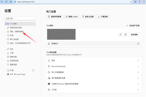 在地址栏输入edge://settings/profiles,或者访问edge设置栏目进入浏览器设置页面。