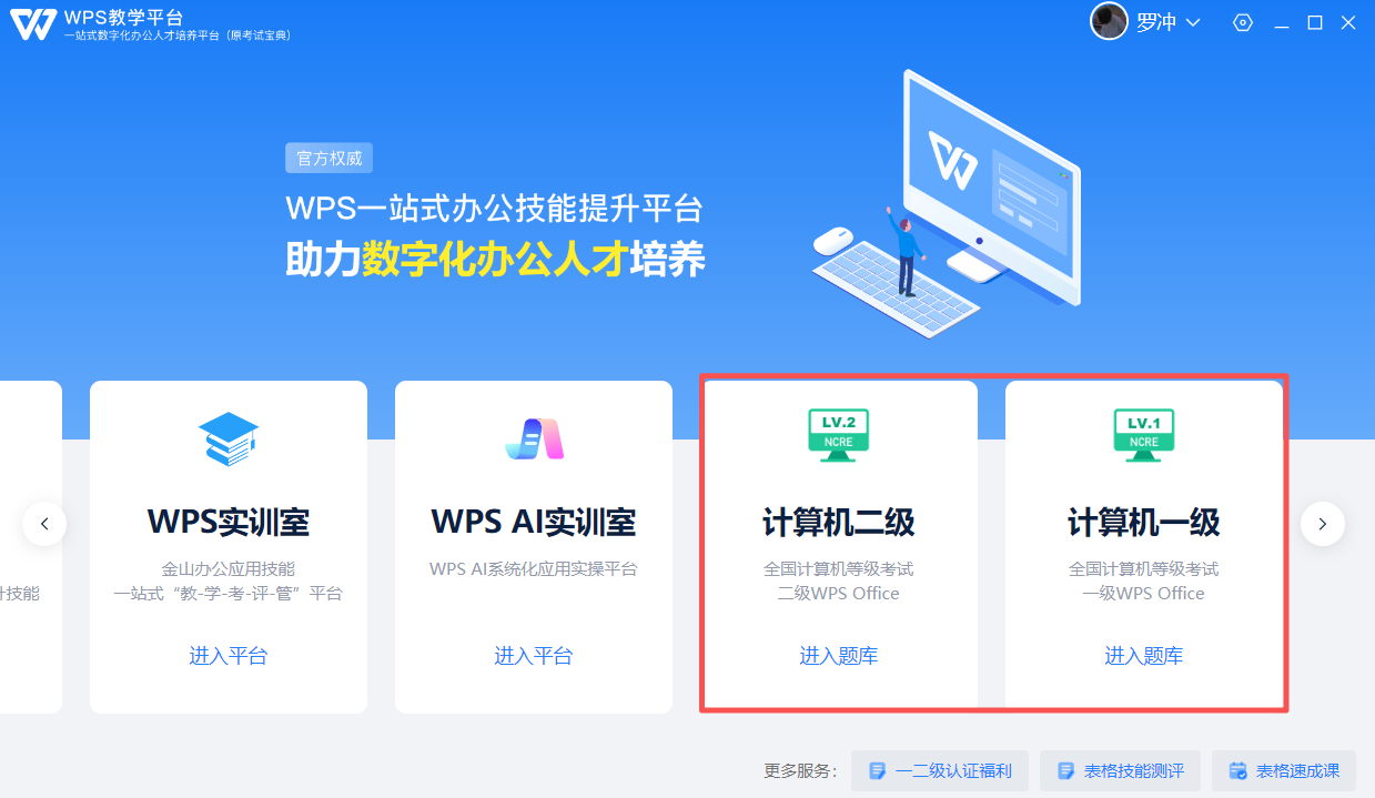 登录成功后,在WPS 365教育版中找到计算机二级题库领取入口“WPS教学平台”,按照提示操作即可领取。(需要登录学校账号才能获得权益,否则无法进行练习)