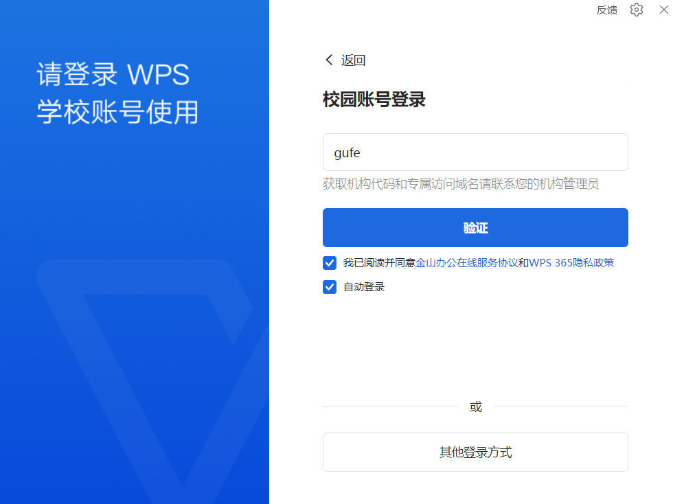 在弹出的页面中输入“gufe”,进入学校统一身份认证界面进行认证,即可激活学校账号获取相应权益。