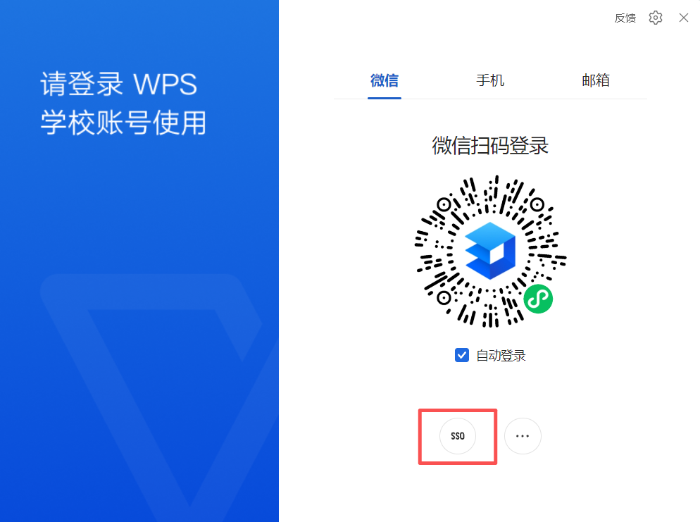 打开WPS 365教育版,点击右上角登录账号。登录界面中选择下方"SSO"进行登录。
